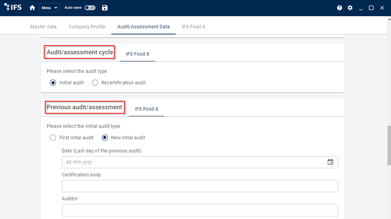 Select whether it is a first initial audit/assessment or a new initial audit/assessment, and fill in the requested data.
