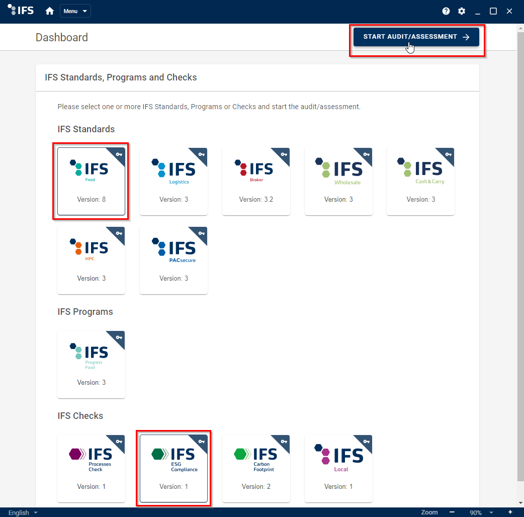 Select one or more IFS Standards, Programs or Checks from the dashboard and start the audit/assessment.