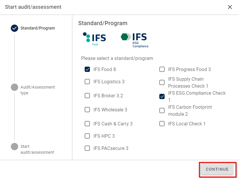 In the first step, the selected IFS Standards, Programs or Checks can be adjusted if needed.