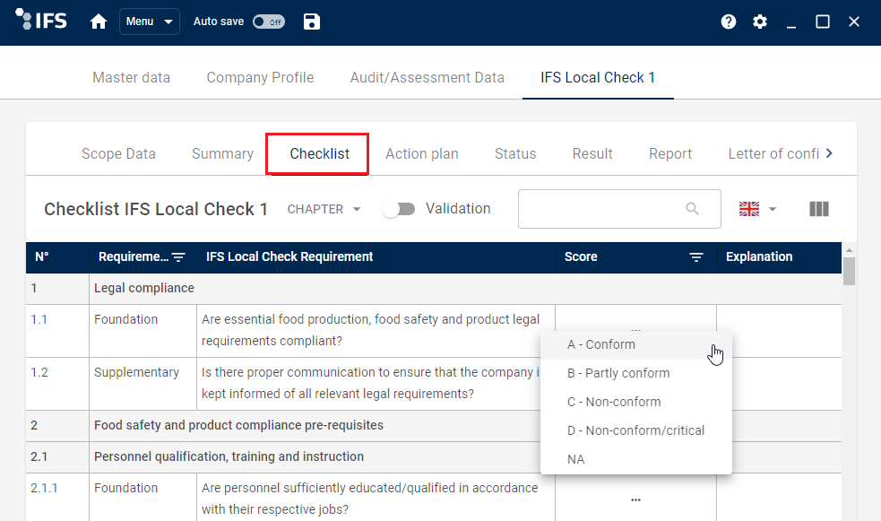 The IFS Local Check scoring system differs from IFS Programs/Standards by being simpler in structure and adapted to the objectives of the check. The auditor/assessor selects the corresponding score from the drop-down menu.