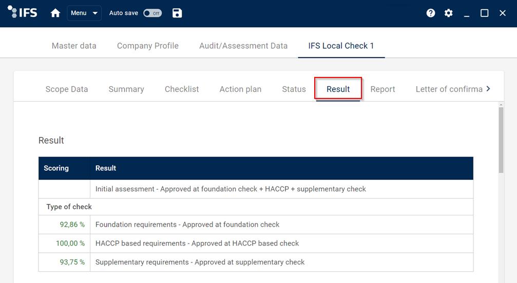 Attempted types of check (foundation, supplementary, HACCP based) will appear both in the report and letter of confirmation. All results/outcomes as shown in the result tab will appear at the report, while in the letter of confirmation approved checks appear only.